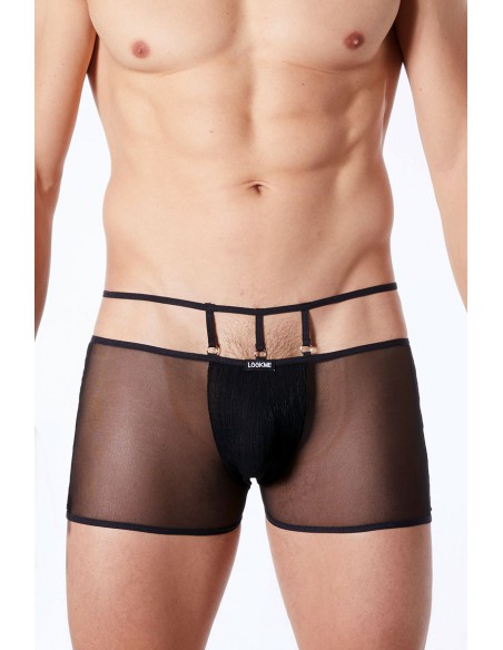 Ce boxer sexy homme est original et élégant avec sa coquille suspendue par des lanières fixées à des anneaux, et le contraste de la fine résille transparente avec la coquille opaque en tissus strié aux reflets brillants.