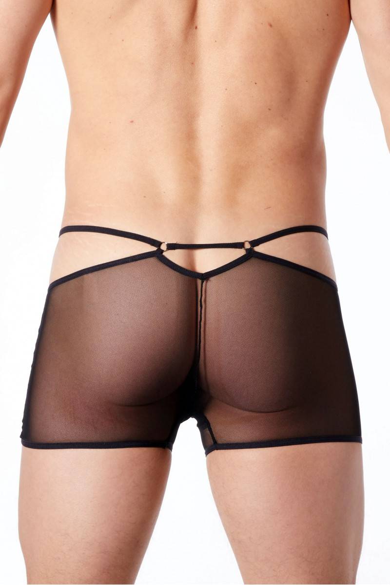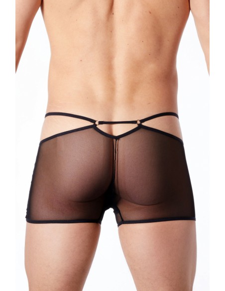 L'arrière totalement fait de résille met parfaitement en valeur les fesses. Les lanières apportent une touche sophistiquée qui accentue le pouvoir d'attraction de ce modèle. Un boxer homme purement érotique.