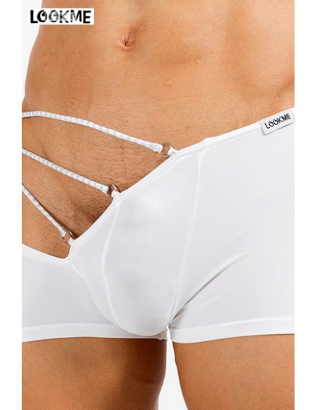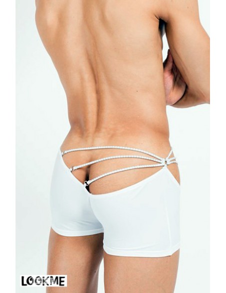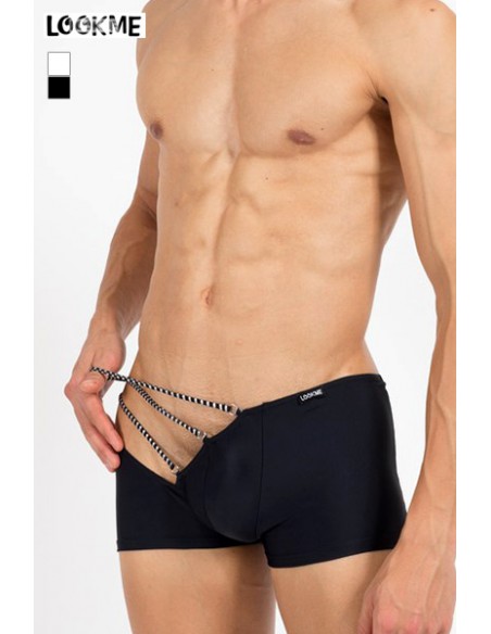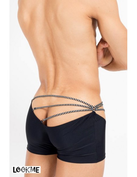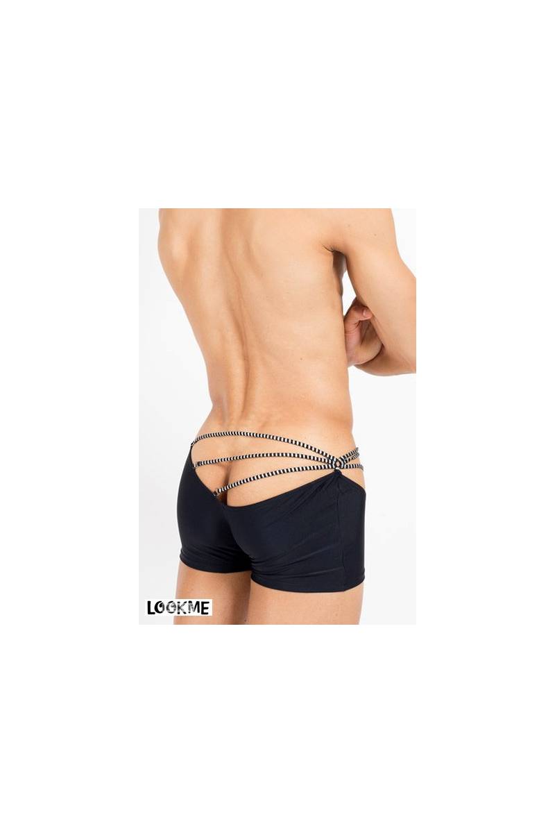 Boxer en lycra découpé devant et derrière d'une ouverture, chacune reliée par 3 lanières qui se rejoignent à la hanche sur un anneau.