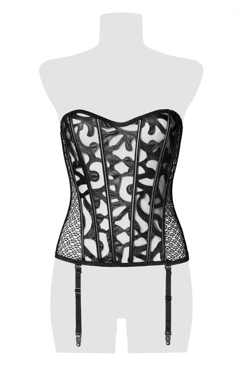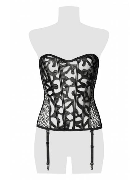 Le design soigné et très féminin de ce corset est un écrin qui met en valeur la silhouette. Les seins bombés, la taille affinée, la transparence du tulle qui laisse deviner l'anatomie sous les riches arabesques florales, le dos habillé d'un tissus ajouré au bel effet, ce corset est une lingerie qui excite les sens.