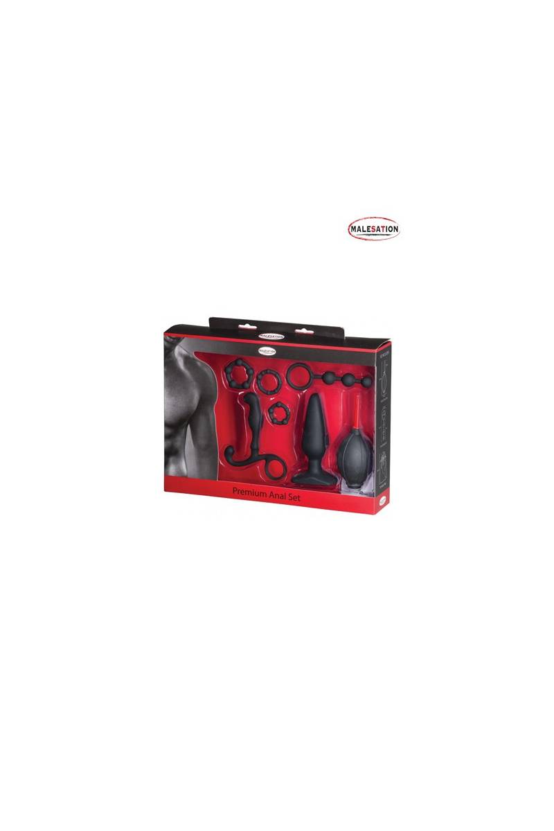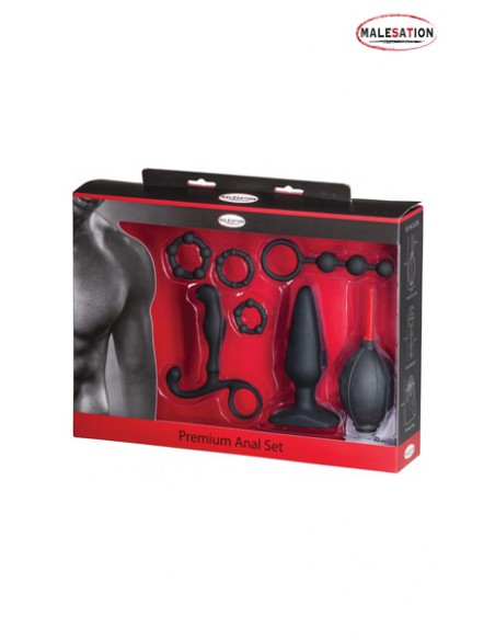 Le Premium anal set, proposé par Malesation, est un kit complet de 5 accessoires utilisés pour la recherche de plaisir anal, accompagné d'un sac de rangement pour y stocker le tout.