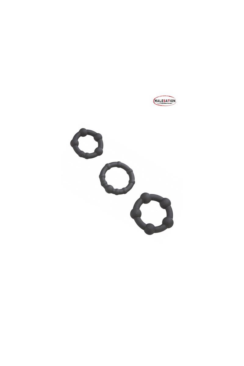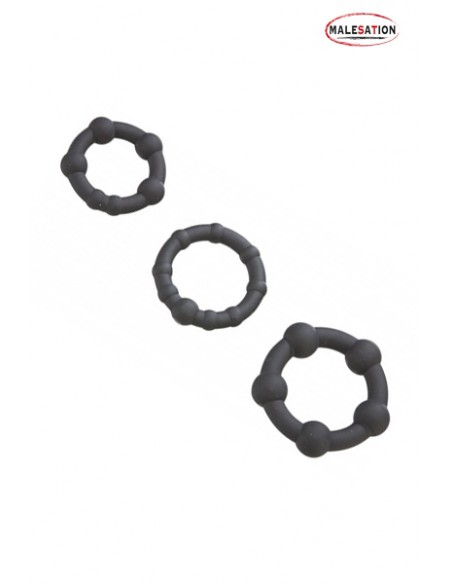 - Malesation Black Pearl Rings: Un jeu de 3 cockrings de tailles différentes, en silicone. Sans phtalate, Ø des anneaux: env. 2,0 cm, 2,5 cm et 3,0 cm