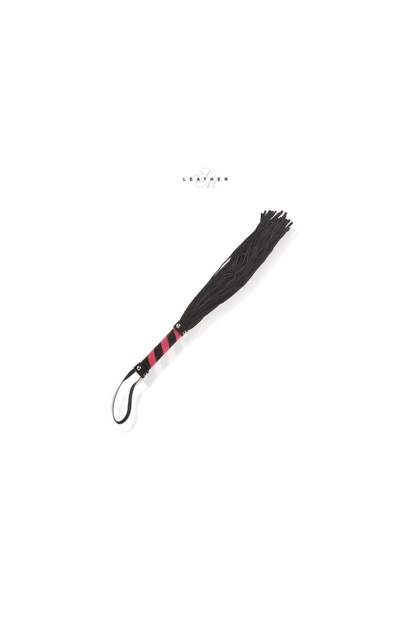 Martinet en cuir (daim) de la marque Leather SM avec 44 lanières extra douces et une poignée rigide bicolore noire et fuchsia.