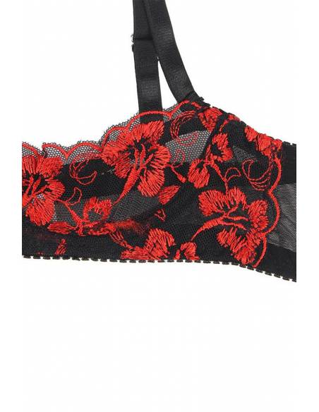 La résille noire rehaussée d'une broderie florale rouge est féminine et séduisante.