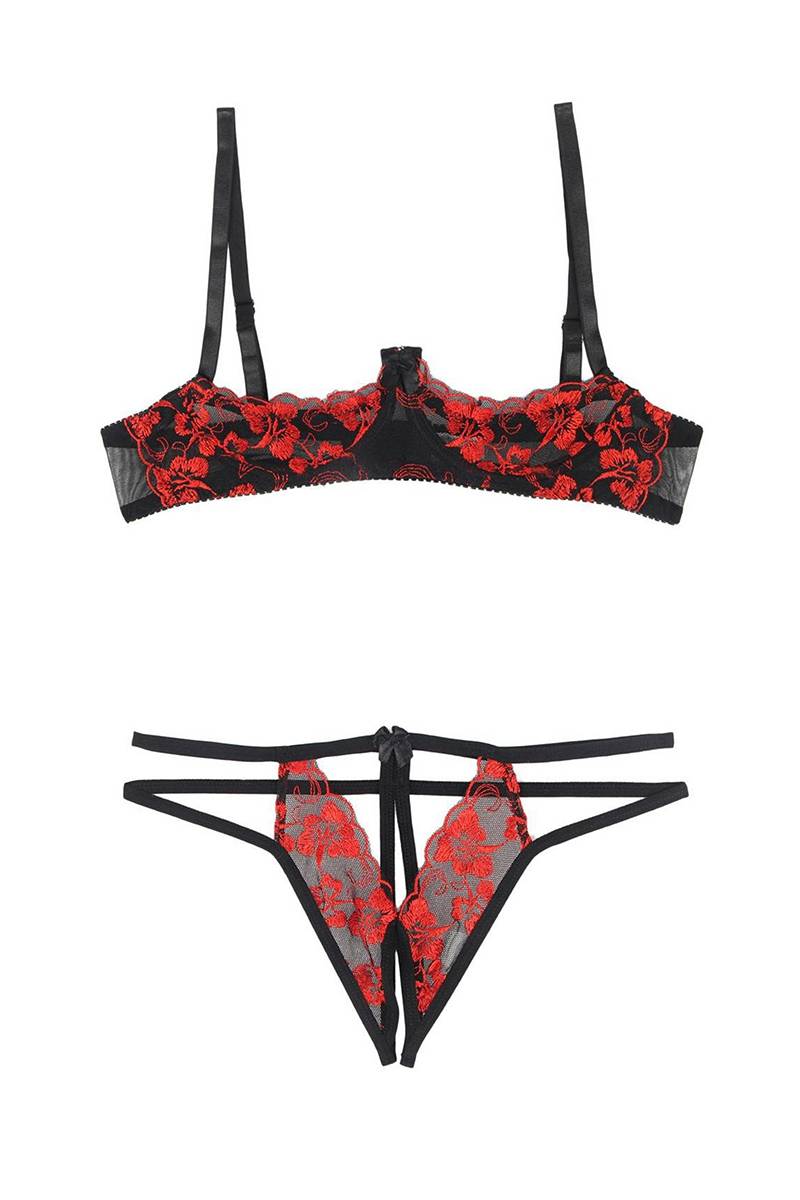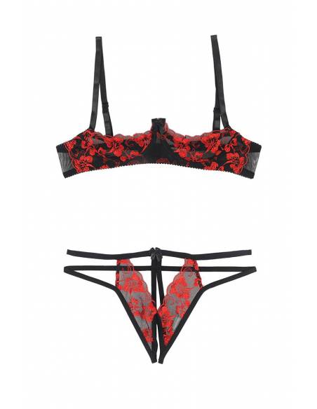 Ensemble lingerie sexy érotique composé d'un soutien-gorge seins nus à armatures, et d'un string fendu.