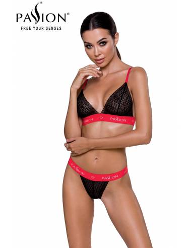 Avec sa jolie brassière aux bonnets triangle et son string parfaitement assorti, cet ensemble de lingerie sexy marie avec brio la sensualité de la dentelle noire, et le style casual des larges ceintures rouges élastiques sous la poitrine et autour des hanches.