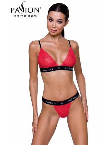 Avec sa jolie brassière aux bonnets triangle et son string parfaitement assorti, cet ensemble de lingerie sexy marie avec brio la sensualité de la dentelle rouge, et le style casual des larges ceintures noires élastiques sous la poitrine et autour des hanches.