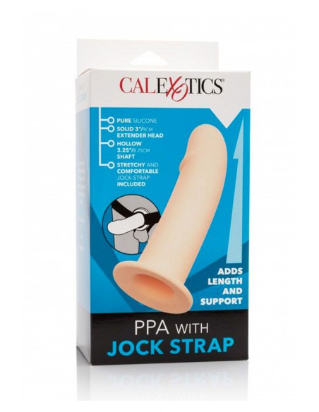 Sextoy de haute qualité, l'extenseur de pénis "PPA with Jock Strap" est conçu en silicone durable, hypoallergénique et inodore. Creux, il s'enfile sur la verge et permet d'accroitre la longueur de celle ci de 9 cm, ainsi que son épaisseur avec un diamètre externe de 5 cm.