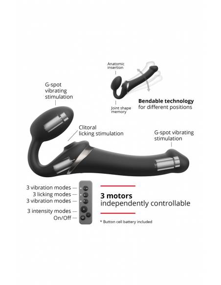 Le gode-ceinture Strap-On-Me "Multi Orgasm" est une évolution du modèle vibrant, doté en plus d'une langue vibrante permettant de simuler un cunnilingus.