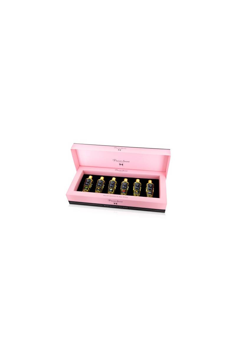 La marque Plaisir Secret propose un luxueux coffret cadeau contenant 6 huiles de massage sèches de la marque.