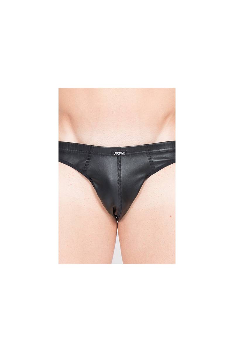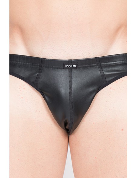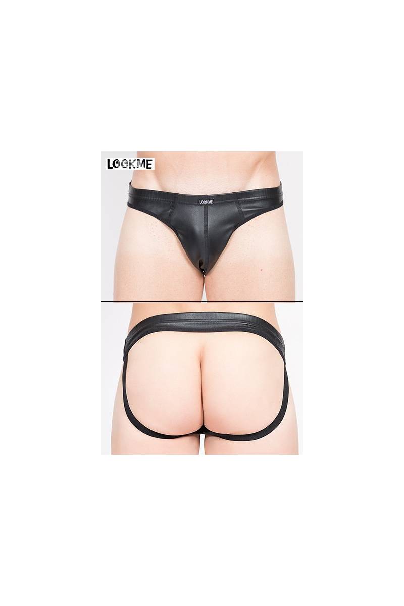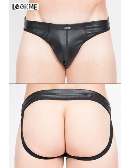 Le faux cuir donne tout son style à ce Jock Strap particulièrement viril. La matière forme une coquille généreuse où le sexe est maintenu confortablement. Les larges élastiques sur les cotés assurent une tenue bien près du corps et soulignent le galbe des fesses.