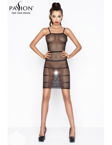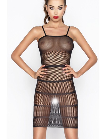 Une petite robe noire à bretelles en résille, qui se porte nue pour profiter pleinement de sa transparence lors de moments coquins, ou par dessus une autre robe pour obtenir un effet de superposition très fashion.
