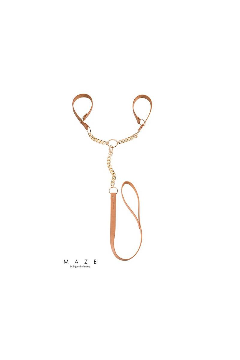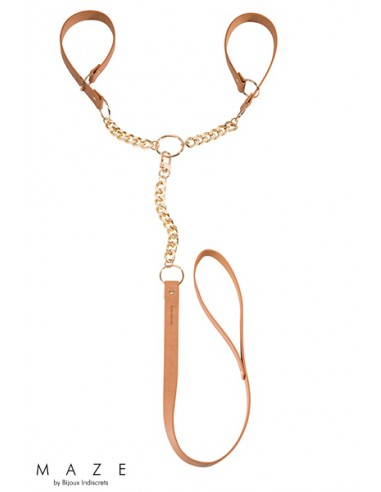 La marque Bijoux Indiscrets propose une paire de menottes et laisse en faux cuir marron avec chaine en métal doré, 100% Vegan, issus de la collection "Maze" inspirée de l'univers BDSM.