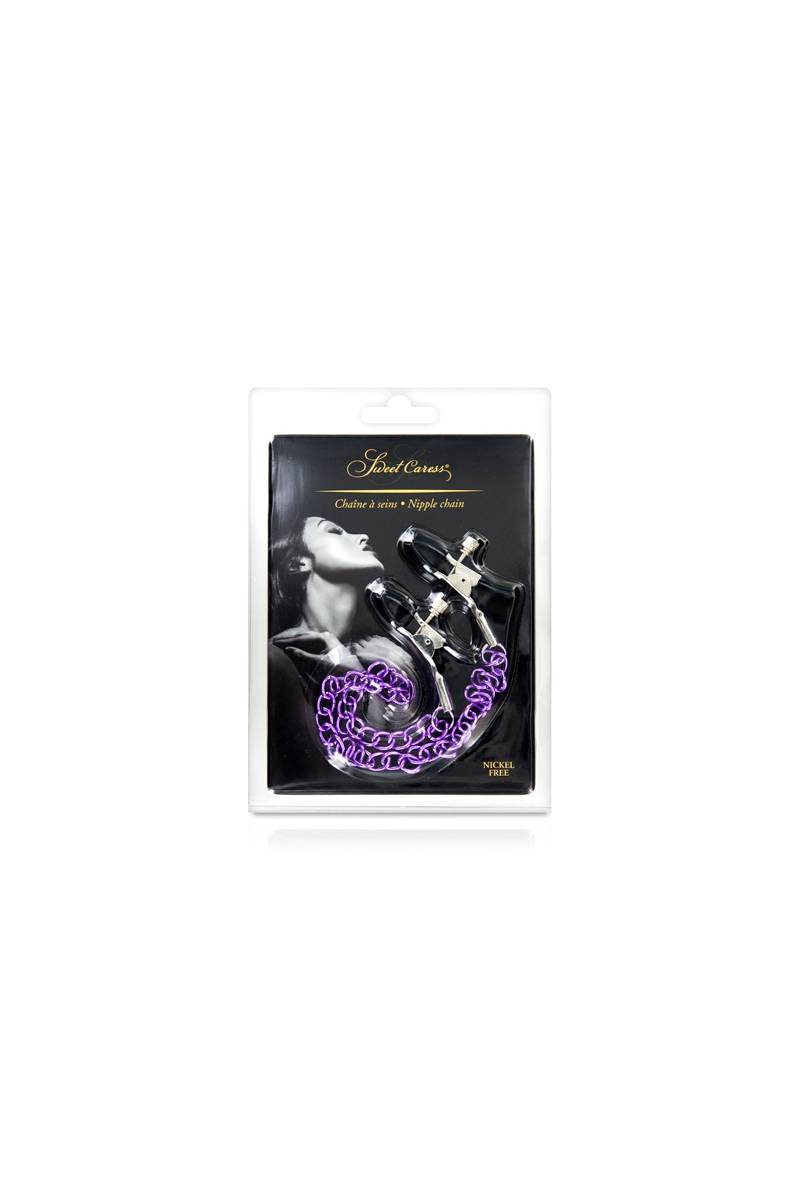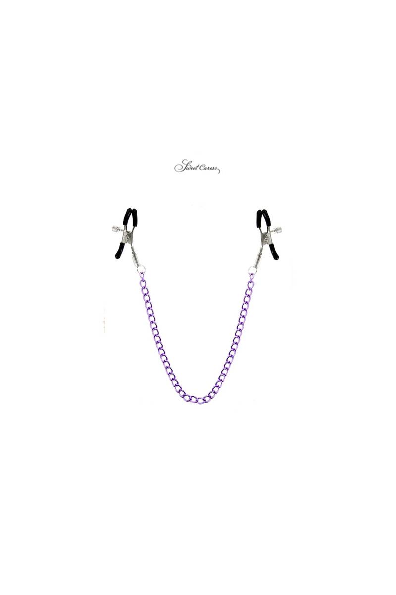 Deux pinces à seins fixées à une chainette en acier coloré, pour stimuler les tétons de votre partenaire, par Sweet Caress.