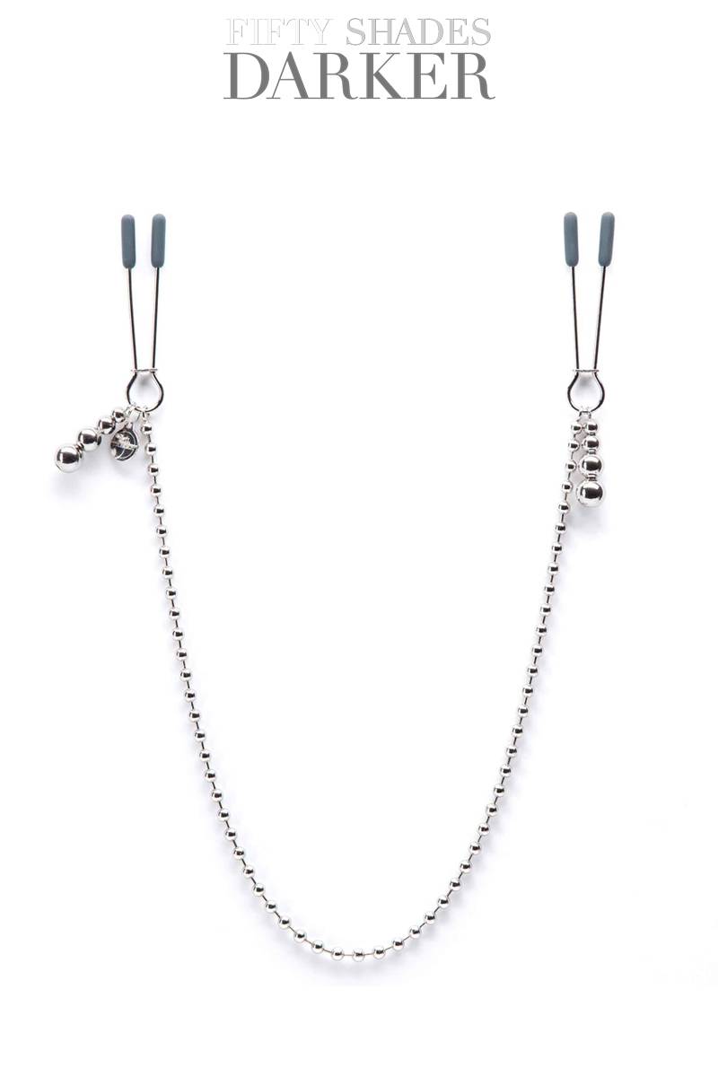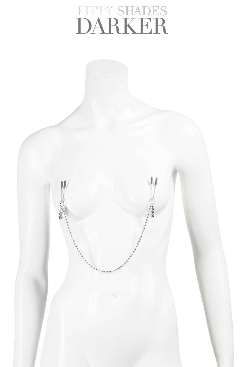 Parfait accessoire de vos jeux BDSM, "At my mercy" est un jeu de petites pinces à tétons avec chaine en métal, par Fifty Shades Darker.