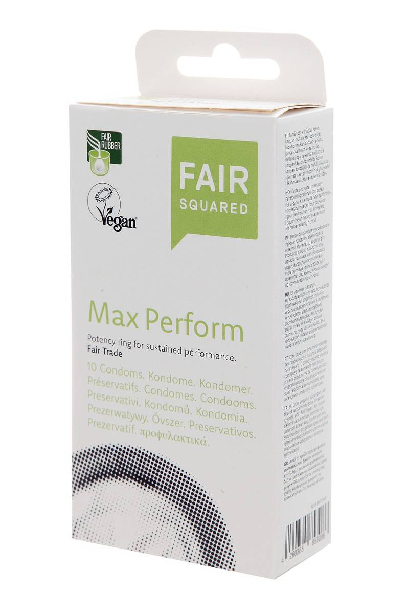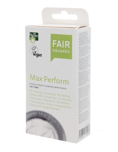 Les préservatifs FAIR SQUARED Max Perform sont Certifiés par la Vegan Society. Avec cockring intégré, transparents, lubrifiés, et de forme cylindrique avec réservoir, il sont fabriqués en Allemagne en latex de caoutchouc naturel issus du commerce équitable.