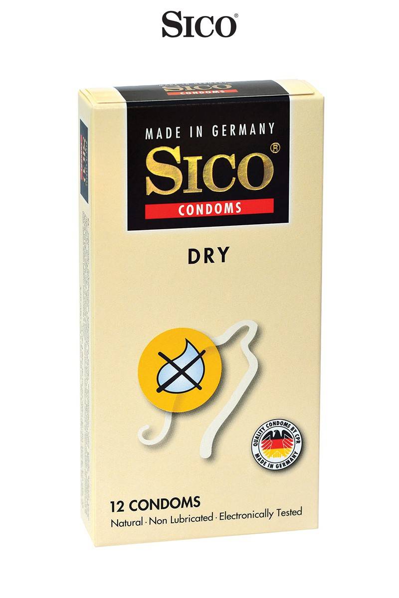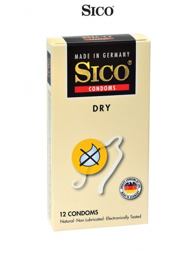Boite de 12 préservatifs Sico DRY en latex de caoutchouc naturel, cylindriques, transparents et non lubrifiés.