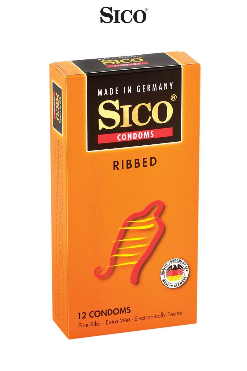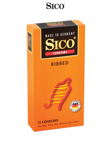Boite de 12 préservatifs Sico RIBBED en latex de caoutchouc naturel, cylindriques, transparents et lubrifiés, avec rainures pour accroitre les sensations féminines.
