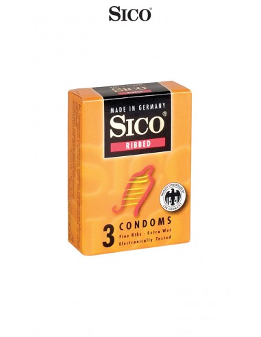 Boite de 3 préservatifs Sico RIBBED en latex de caoutchouc naturel, cylindriques, transparents et lubrifiés, avec rainures pour accroitre les sensations féminines.