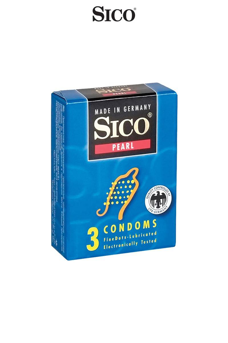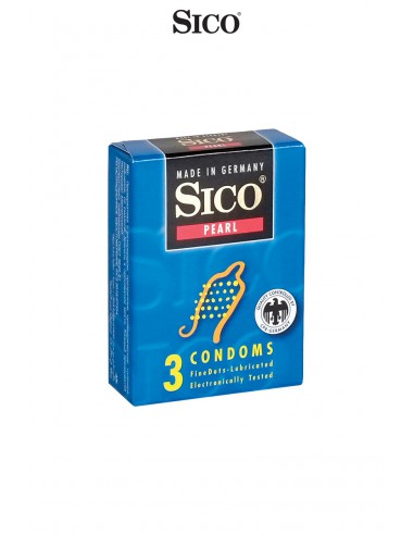 Boite de 3 préservatifs Sico PEARL en latex de caoutchouc naturel, cylindriques, transparents et lubrifiés, avec une texture perlée pour accroitre les sensations feminines.
