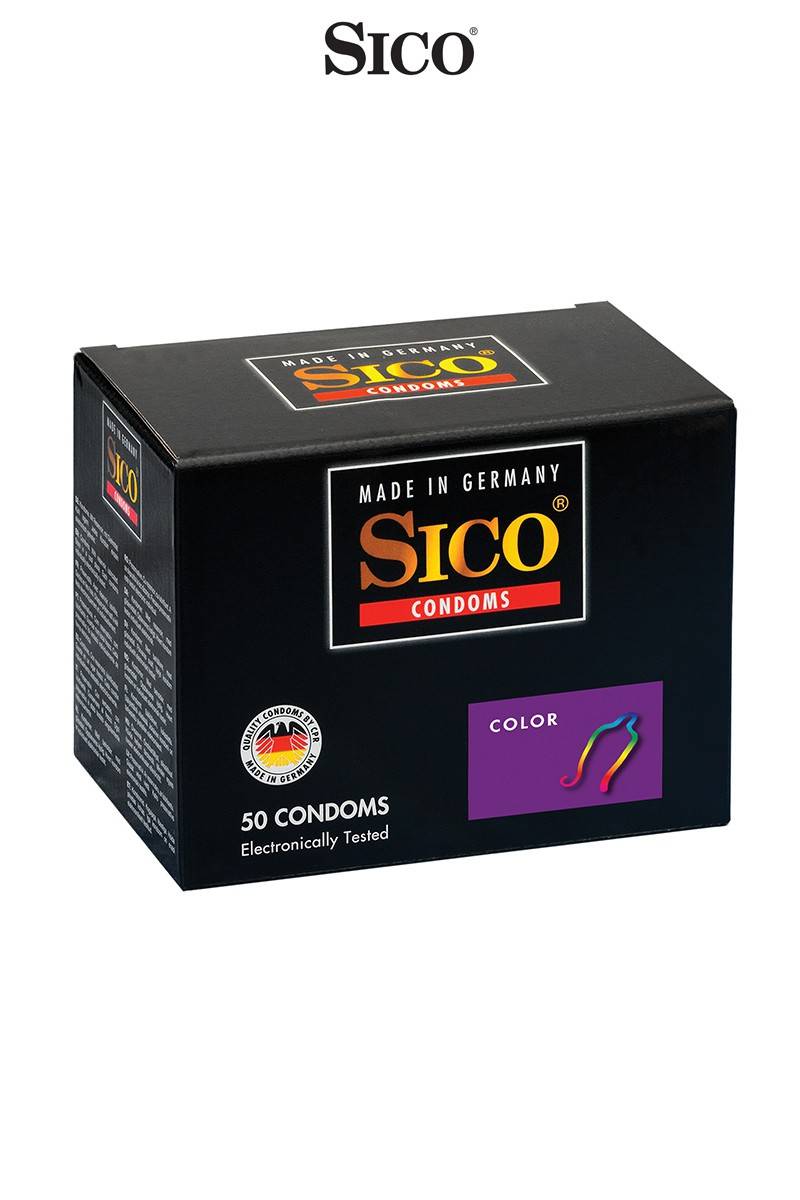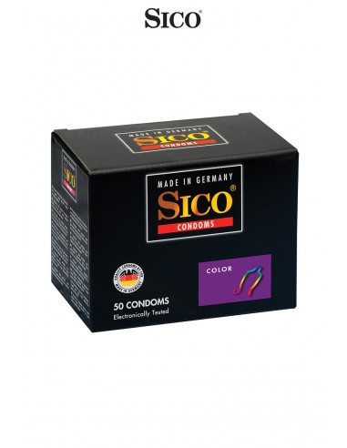 Boite de 50 préservatifs Sico COLOUR en latex de caoutchouc naturel, colorés, cylindriques, parfumés et lubrifiés.