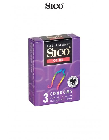 Boite de 3 préservatifs Sico COLOUR en latex de caoutchouc naturel, colorés, cylindriques, parfumés et lubrifiés.