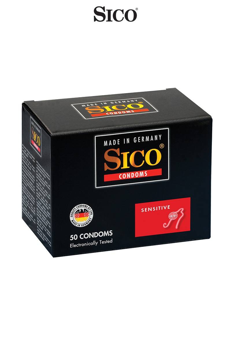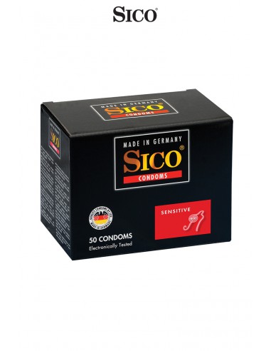 Boite de 50 préservatifs Sico SENSITIVE en latex de caoutchouc naturel, transparents, cylindriques, lubrifiés et avec une épaisseur de paroi très fine offrant des sensations proches de relations sans préservatif.