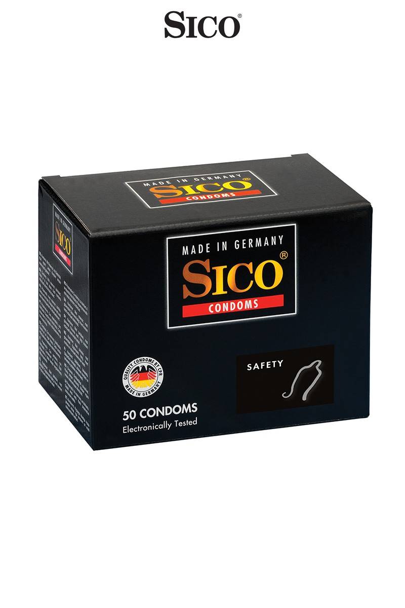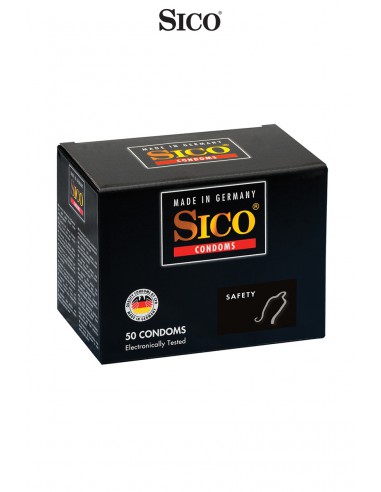 Boite de 50 préservatifs Sico SAFETY en latex de caoutchouc naturel, transparents, cylindriques, lubrifiés et assurant une sécurité renforcée tout en offrant une grande sensibilité.