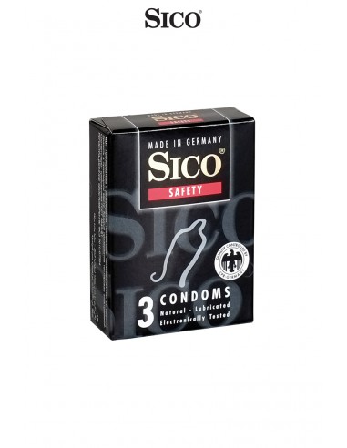 Boite de 3 préservatifs Sico SAFETY en latex de caoutchouc naturel, transparents, cylindriques, lubrifiés et assurant une sécurité renforcée tout en offrant une grande sensibilité.