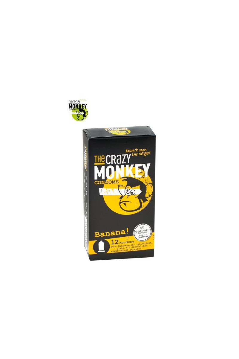 Boite de 12 préservatifs lubrifiés, parfumés à la banane, en latex naturel avec réservoir, marque The Crazy Monkey.