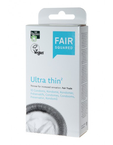 Les préservatifs FAIR SQUARED Ultra thin sont Certifiés par la Vegan Society. Ultra-fins (0,055 mm d'épaisseur), transparents, lubrifiés, et de forme cylindrique avec réservoir, il sont fabriqués en Allemagne en latex de caoutchouc naturel issus du commerce équitable.