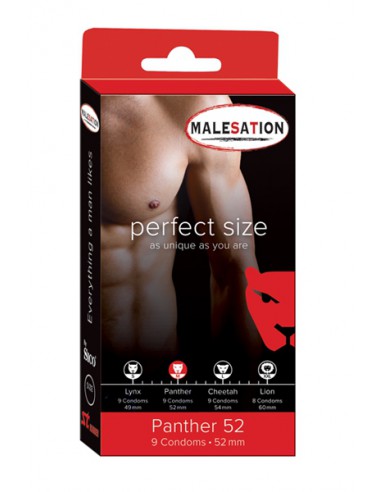 9 Préservatifs Perfect size Panther, diamètre 52 mm, de forme cylindrique avec réservoir, transparents et lubrifiés, en latex de caoutchouc naturel, fabriqués en Allemagne par la marque Malesation.