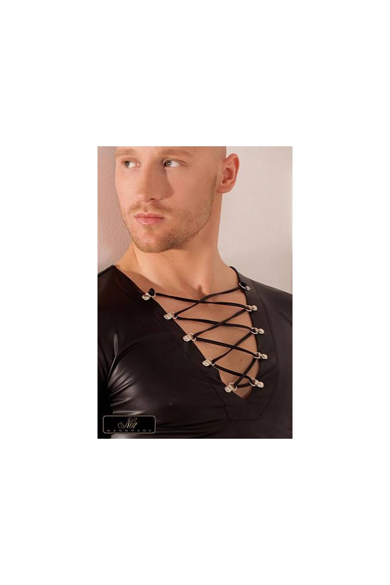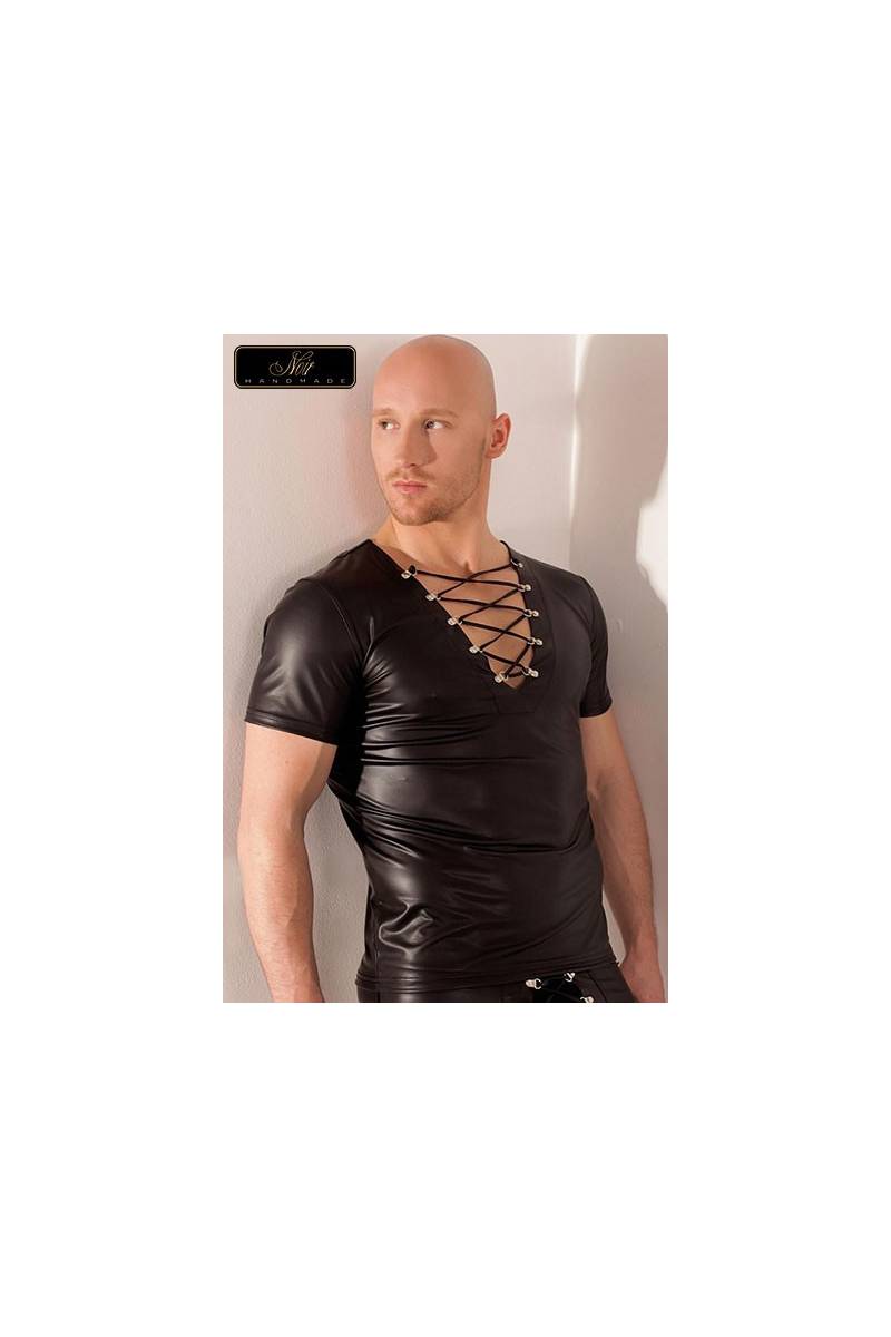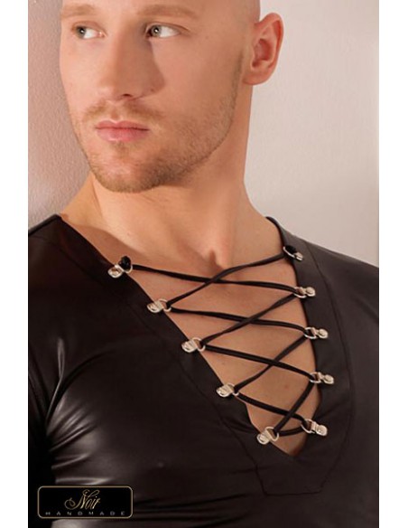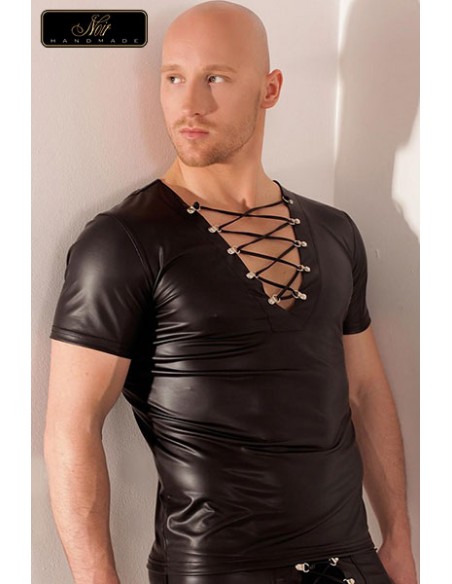 Soyez l'incarnation de la virilité avec ce tee-shirt très hot en wetlook moulant aux reflets brillants.