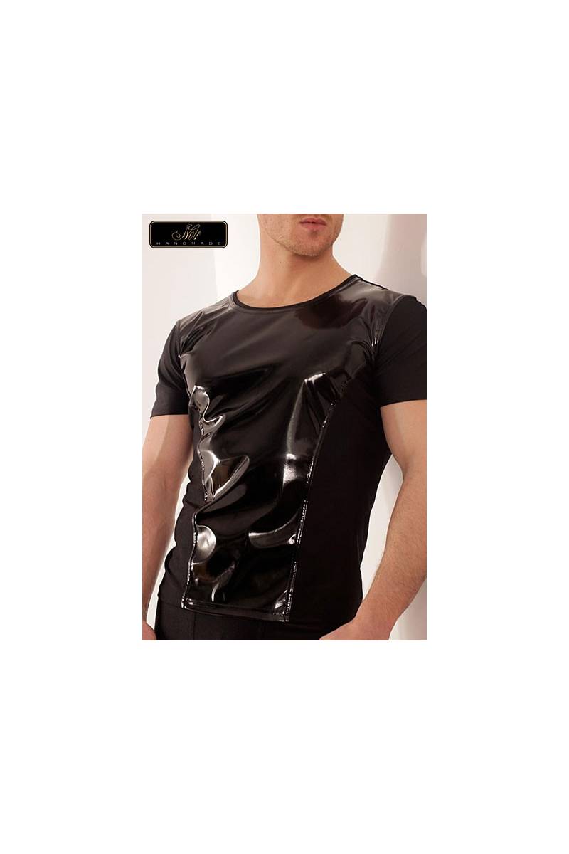 L'alliance du lycra doux et moulant, et du vinyle brillant, dans un tee shirt masculin au look à la fois viril et classe.
