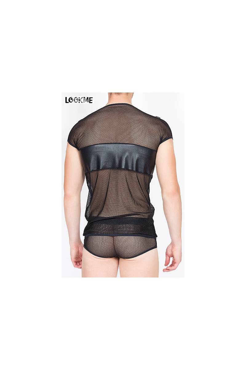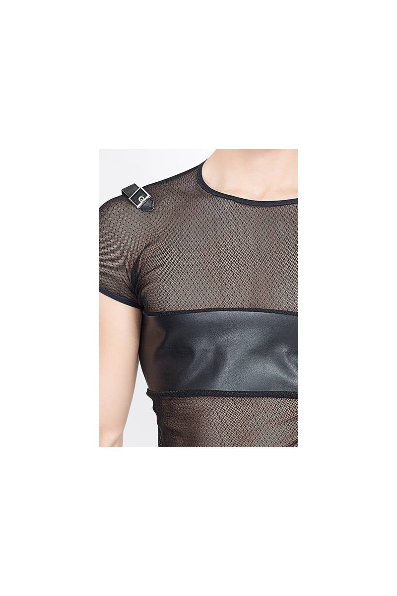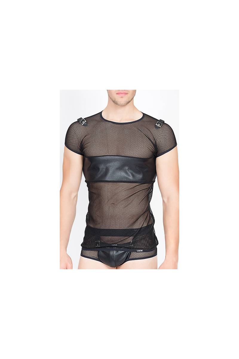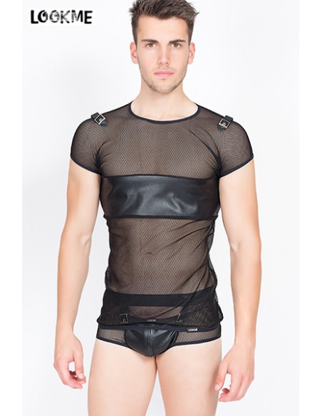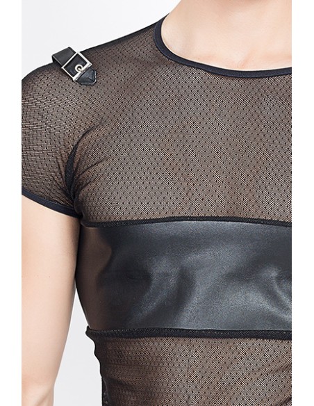 Ce tee-shirt homme est vraiment sexy avec sa matière transparente faite de résille fantaisie douce et fluide, et l'effet opaque et viril de la large bande faux cuir qui barre le torse.