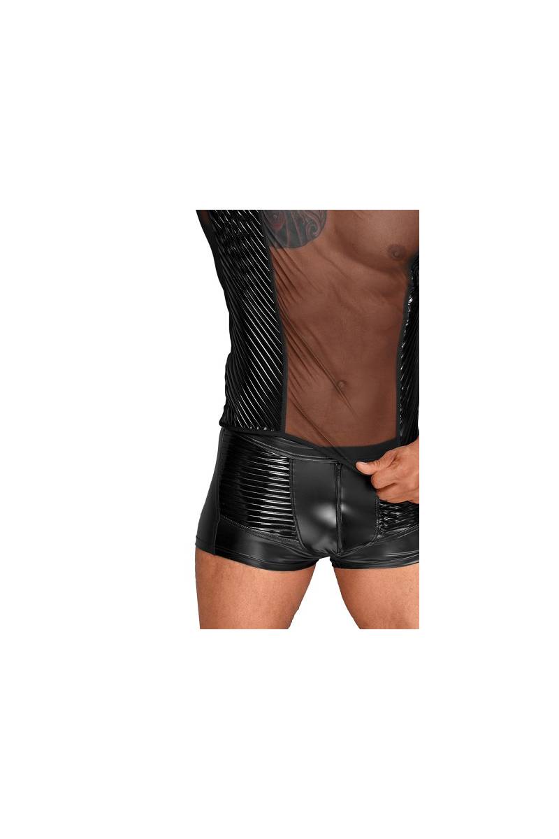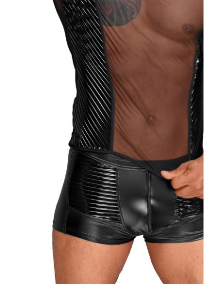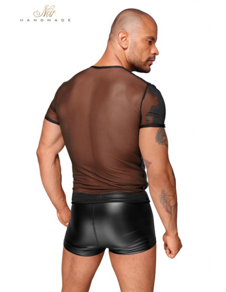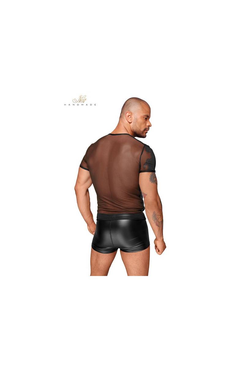 Un T-shirt col V particulièrement sexy et stylé avec son tulle transparent qui met en valeur la musculature, et ses empiècements de vinyle brillant.