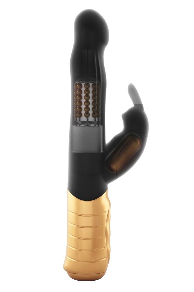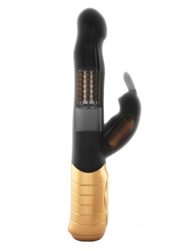 Le petit lapin vibrant sur le côté s'occupe de la stimulation clitoridienne tandis que des rangées de billes tournantes situées dans le corps du vibromasseur décuplent la stimulation vaginale à chaque va et vient du sextoy.